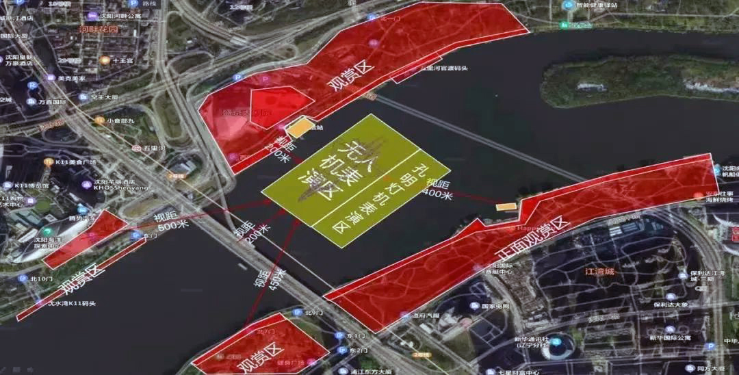無(wú)人機(jī)表演位置位于盛京大劇院南側(cè)河面上空,渾河兩岸均可觀賞。根據(jù)無(wú)人機(jī)空中圖像位置和高度,建議觀賞區(qū)域如下:1. 渾河南岸由渾河大橋以東至南洋碼頭區(qū)間;2. 渾河北岸由渾河大橋以東至秦開(kāi)像南面的觀景臺(tái)區(qū)間;3. 渾河大橋以西南北兩岸距渾河大橋500米以內(nèi)區(qū)間。