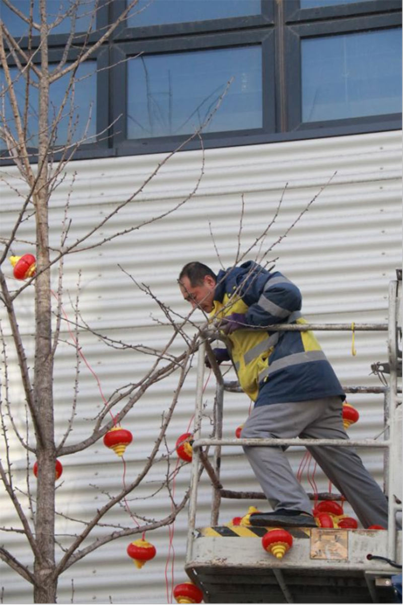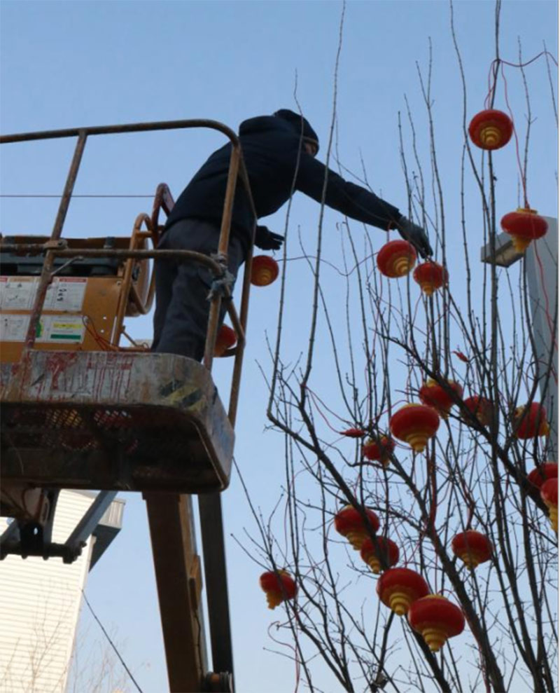 為給園區(qū)營造濃厚的節(jié)日氣氛,給入駐企業(yè)帶來如家般的溫情呵護(hù),沈陽航發(fā)展運營管理有限公司物業(yè)團(tuán)隊,在零下二十度的氣溫下,凍紅了雙手,冰覆了睫毛,但他們依然堅守,扶梯的扶梯、攀爬的攀爬,將火紅的燈籠掛在園區(qū)主干道、企業(yè)門前。滿街的火紅,是他們對園區(qū)的熱愛,也是對工作的執(zhí)著,更是對崗位責(zé)任的滿滿執(zhí)念。園區(qū)的燈亮了,客戶們洋溢的笑臉,映襯著角落里一道道靚麗的風(fēng)景線,夜幕降臨下,五彩斑斕的彩色燈光給園區(qū)增添了不少喜慶的色彩,也深深的印在了師傅們熱切的心里。